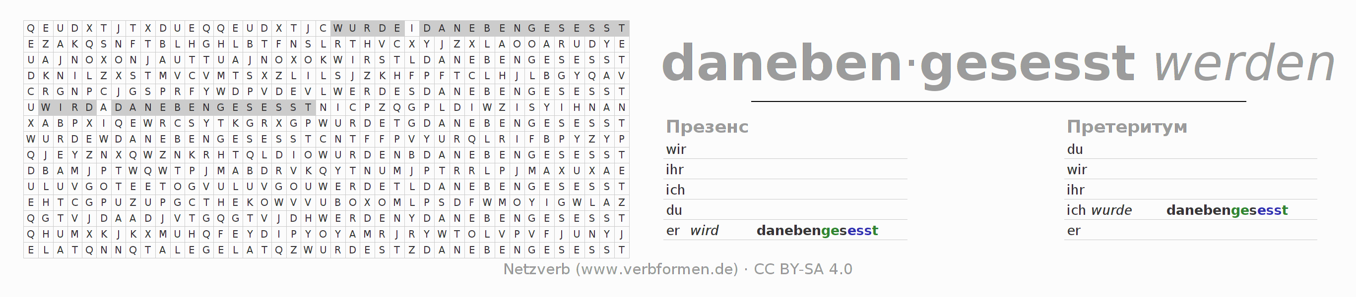 Инструкция: образовать формы глагола danebensitzen и найти их в головоломке, либо распознать изменённую форму danebensitzen в буквенном винегрете и соотнести ее с правильной формой глагола. Умлауты и -ß- транслитерируются соответственно как -oe-, -ae-, -ue- и -ss-.Ответ находится в конце страницы.