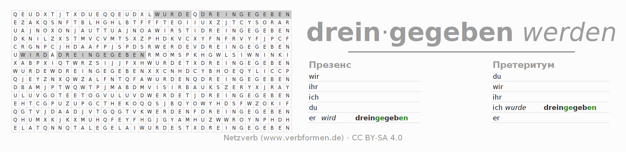 Инструкция: образовать формы глагола dreingeben и найти их в головоломке, либо распознать изменённую форму dreingeben в буквенном винегрете и соотнести ее с правильной формой глагола. Умлауты и -ß- транслитерируются соответственно как -oe-, -ae-, -ue- и -ss-.Ответ находится в конце страницы.