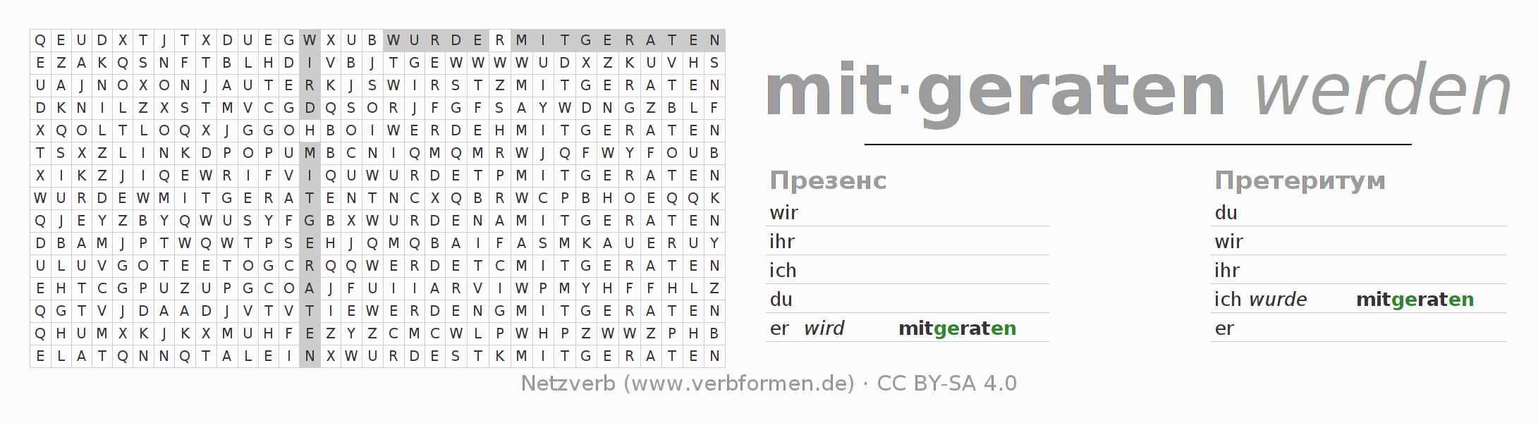 Инструкция: образовать формы глагола mitraten и найти их в головоломке, либо распознать изменённую форму mitraten в буквенном винегрете и соотнести ее с правильной формой глагола. Умлауты и -ß- транслитерируются соответственно как -oe-, -ae-, -ue- и -ss-.Ответ находится в конце страницы.