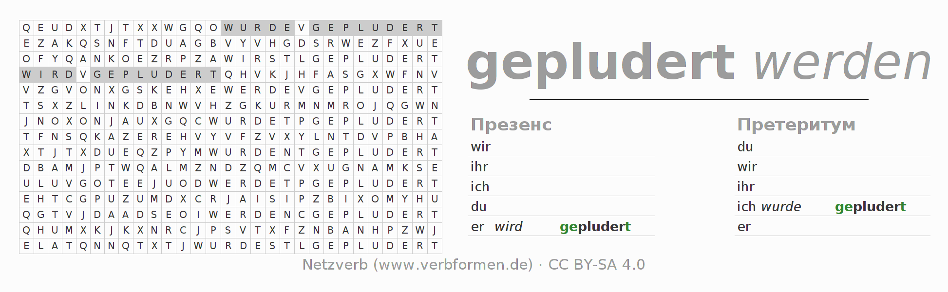 Инструкция: образовать формы глагола pludern и найти их в головоломке, либо распознать изменённую форму pludern в буквенном винегрете и соотнести ее с правильной формой глагола. Умлауты и -ß- транслитерируются соответственно как -oe-, -ae-, -ue- и -ss-.Ответ находится в конце страницы.