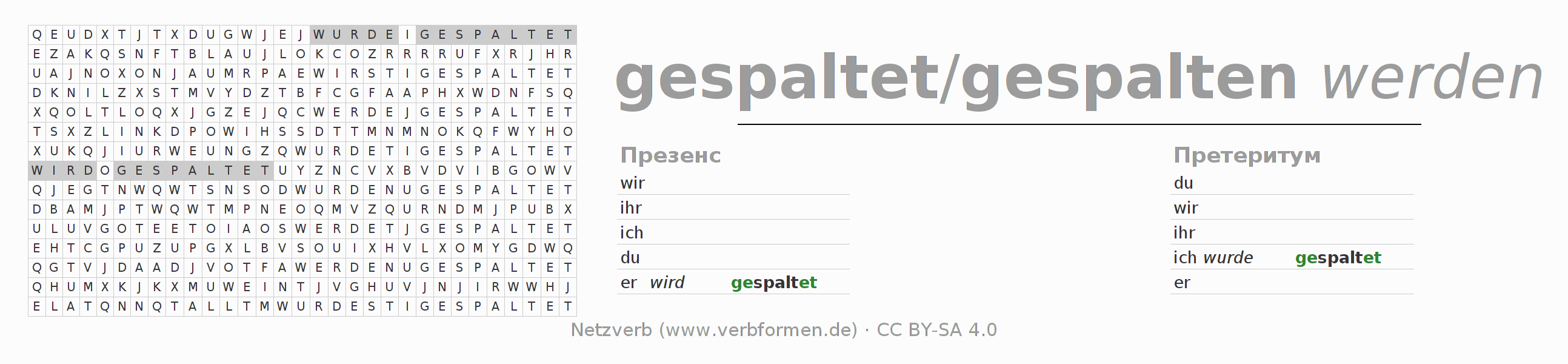 Инструкция: образовать формы глагола spalten и найти их в головоломке, либо распознать изменённую форму spalten в буквенном винегрете и соотнести ее с правильной формой глагола. Умлауты и -ß- транслитерируются соответственно как -oe-, -ae-, -ue- и -ss-.Ответ находится в конце страницы.