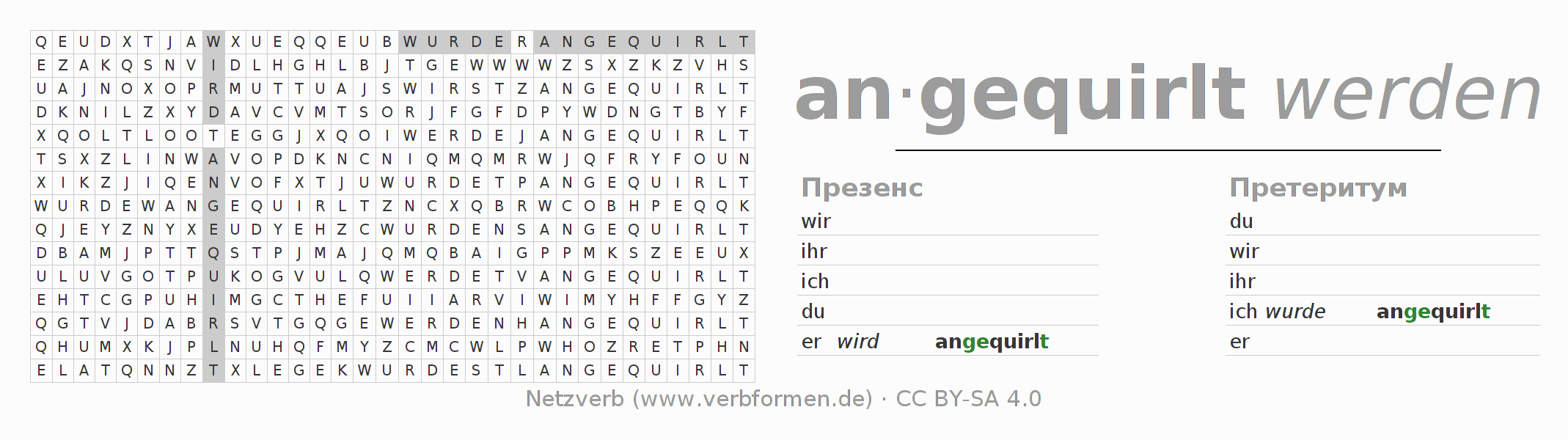 Инструкция: образовать формы глагола anquirlen и найти их в головоломке, либо распознать изменённую форму anquirlen в буквенном винегрете и соотнести ее с правильной формой глагола. Умлауты и -ß- транслитерируются соответственно как -oe-, -ae-, -ue- и -ss-.Ответ находится в конце страницы.
