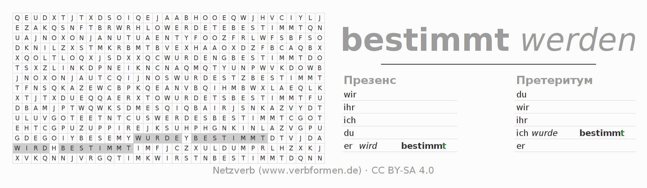 Инструкция: образовать формы глагола bestimmen и найти их в головоломке, либо распознать изменённую форму bestimmen в буквенном винегрете и соотнести ее с правильной формой глагола. Умлауты и -ß- транслитерируются соответственно как -oe-, -ae-, -ue- и -ss-.Ответ находится в конце страницы.