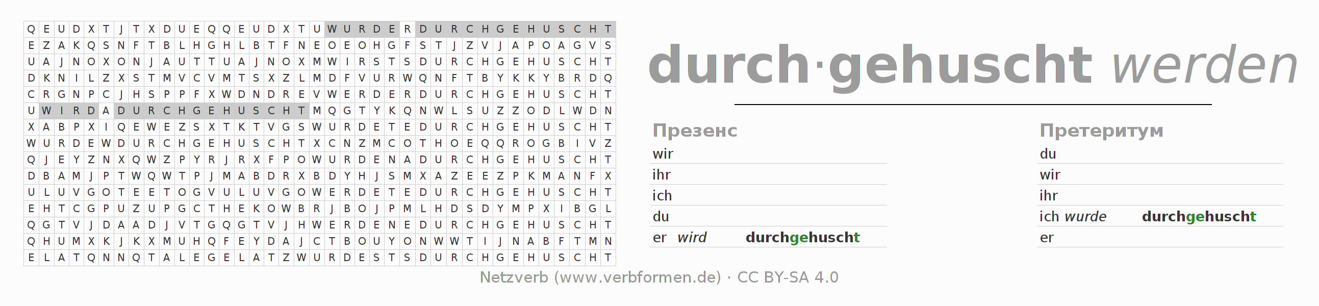 Инструкция: образовать формы глагола durchhuschen и найти их в головоломке, либо распознать изменённую форму durchhuschen в буквенном винегрете и соотнести ее с правильной формой глагола. Умлауты и -ß- транслитерируются соответственно как -oe-, -ae-, -ue- и -ss-.Ответ находится в конце страницы.