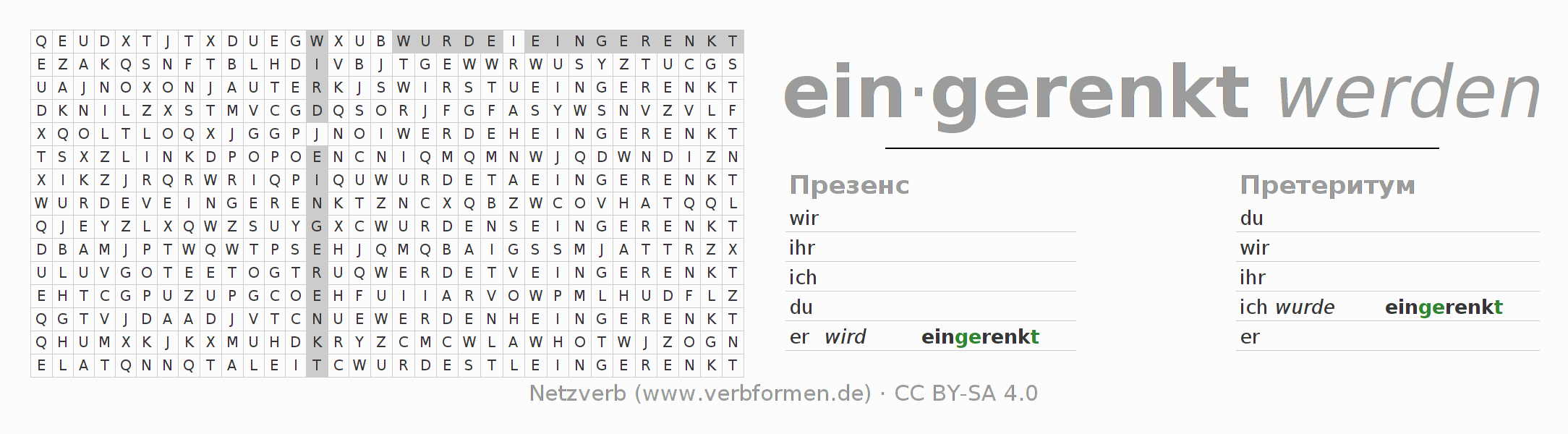 Инструкция: образовать формы глагола einrenken и найти их в головоломке, либо распознать изменённую форму einrenken в буквенном винегрете и соотнести ее с правильной формой глагола. Умлауты и -ß- транслитерируются соответственно как -oe-, -ae-, -ue- и -ss-.Ответ находится в конце страницы.
