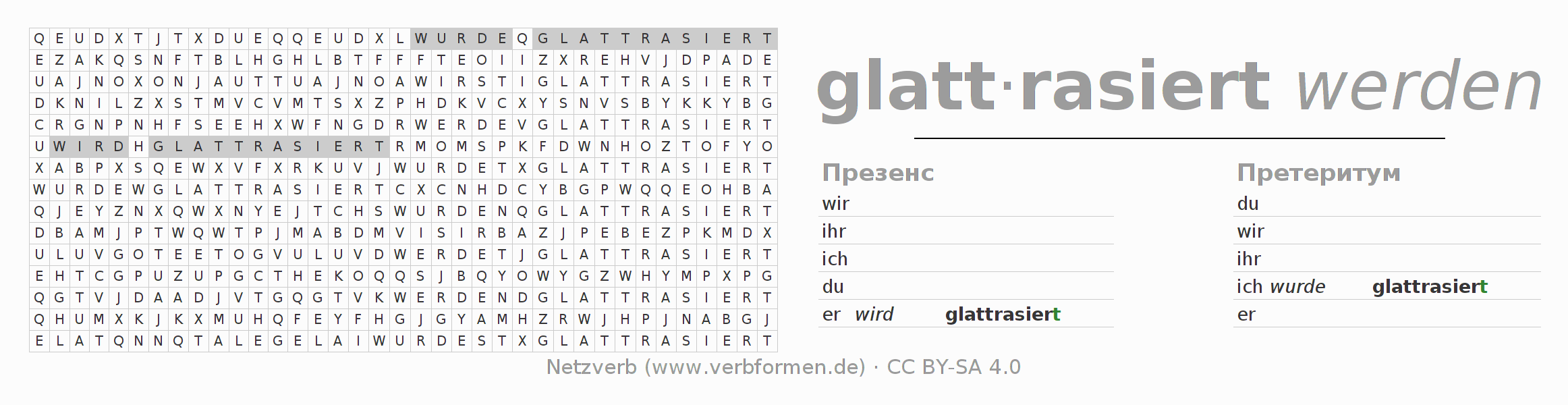 Инструкция: образовать формы глагола glattrasieren и найти их в головоломке, либо распознать изменённую форму glattrasieren в буквенном винегрете и соотнести ее с правильной формой глагола. Умлауты и -ß- транслитерируются соответственно как -oe-, -ae-, -ue- и -ss-.Ответ находится в конце страницы.