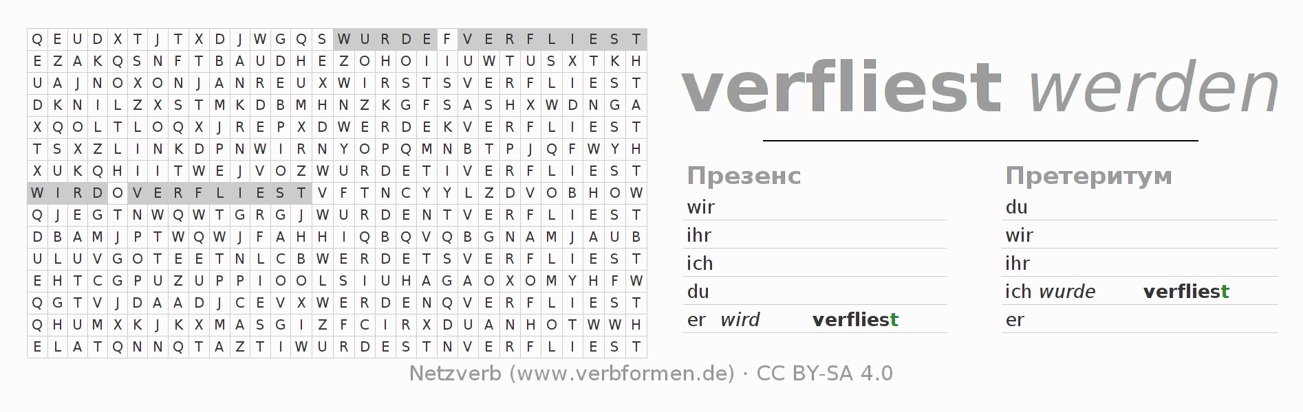 Инструкция: образовать формы глагола verfliesen и найти их в головоломке, либо распознать изменённую форму verfliesen в буквенном винегрете и соотнести ее с правильной формой глагола. Умлауты и -ß- транслитерируются соответственно как -oe-, -ae-, -ue- и -ss-.Ответ находится в конце страницы.