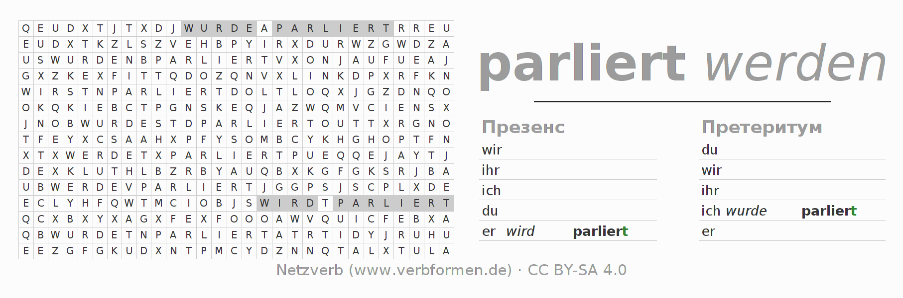 Инструкция: образовать формы глагола parlieren и найти их в головоломке, либо распознать изменённую форму parlieren в буквенном винегрете и соотнести ее с правильной формой глагола. Умлауты и -ß- транслитерируются соответственно как -oe-, -ae-, -ue- и -ss-.Ответ находится в конце страницы.