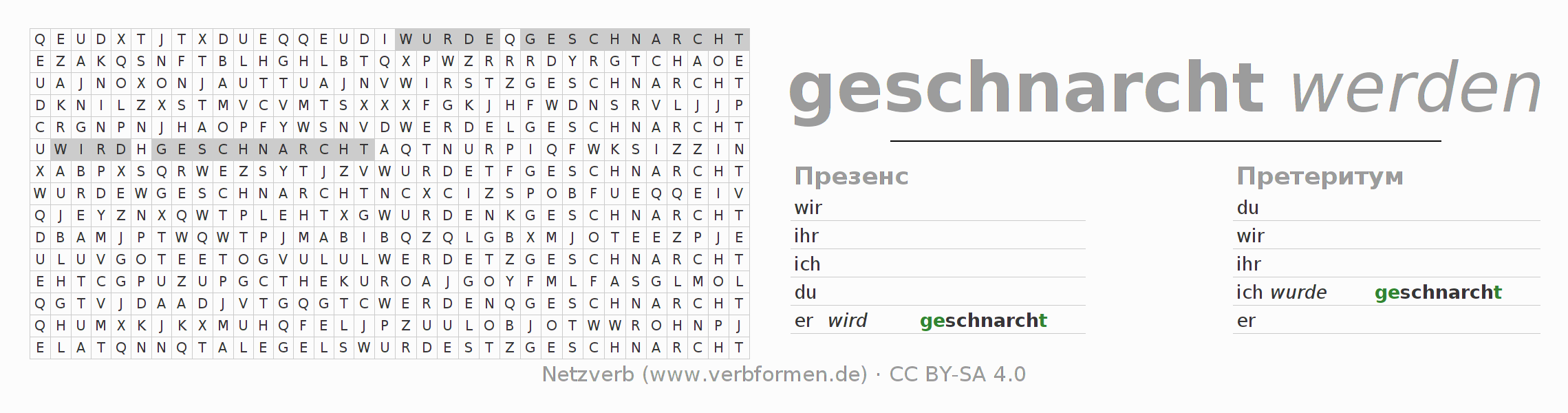 Инструкция: образовать формы глагола schnarchen и найти их в головоломке, либо распознать изменённую форму schnarchen в буквенном винегрете и соотнести ее с правильной формой глагола. Умлауты и -ß- транслитерируются соответственно как -oe-, -ae-, -ue- и -ss-.Ответ находится в конце страницы.
