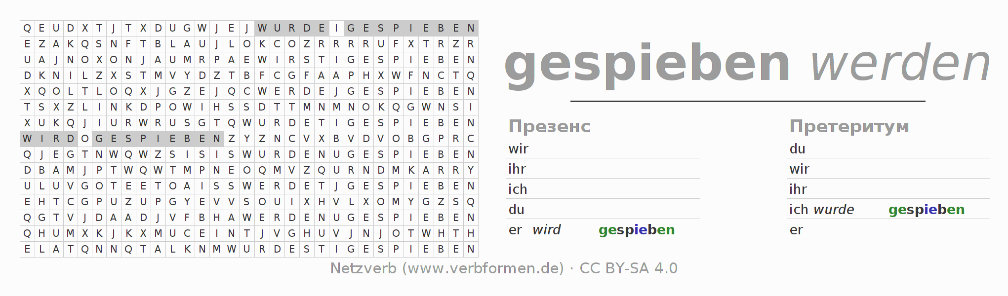 Инструкция: образовать формы глагола speiben и найти их в головоломке, либо распознать изменённую форму speiben в буквенном винегрете и соотнести ее с правильной формой глагола. Умлауты и -ß- транслитерируются соответственно как -oe-, -ae-, -ue- и -ss-.Ответ находится в конце страницы.