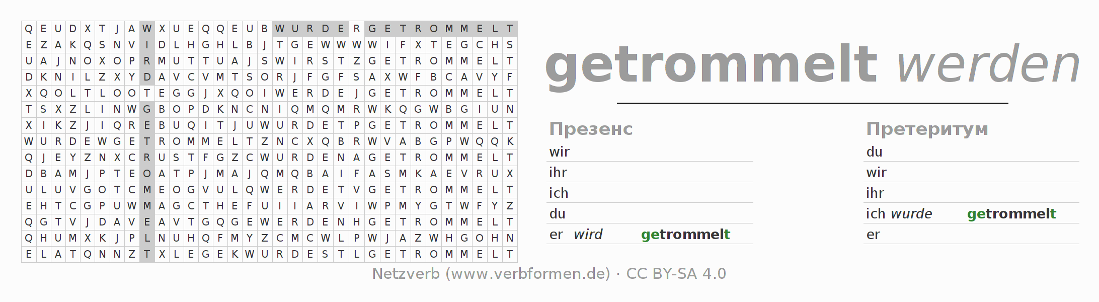 Инструкция: образовать формы глагола trommeln и найти их в головоломке, либо распознать изменённую форму trommeln в буквенном винегрете и соотнести ее с правильной формой глагола. Умлауты и -ß- транслитерируются соответственно как -oe-, -ae-, -ue- и -ss-.Ответ находится в конце страницы.