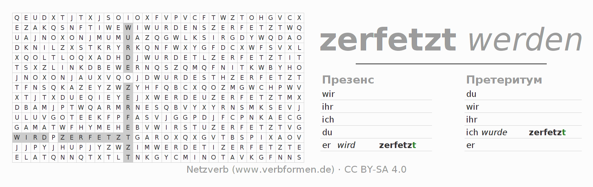 Инструкция: образовать формы глагола zerfetzen и найти их в головоломке, либо распознать изменённую форму zerfetzen в буквенном винегрете и соотнести ее с правильной формой глагола. Умлауты и -ß- транслитерируются соответственно как -oe-, -ae-, -ue- и -ss-.Ответ находится в конце страницы.