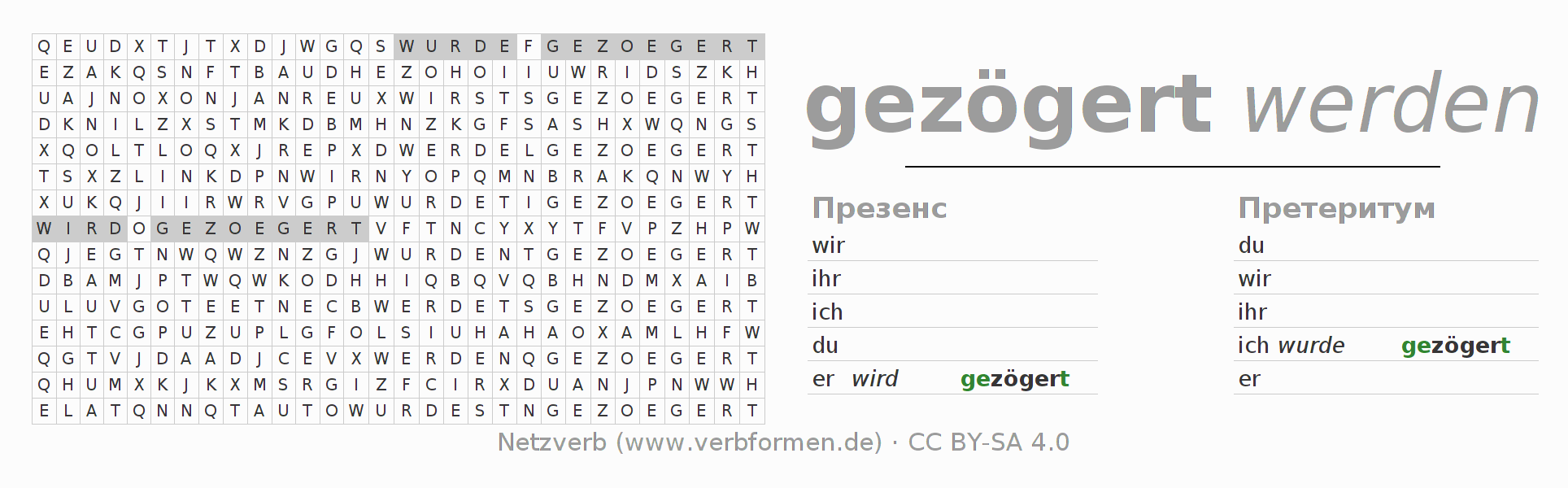 Инструкция: образовать формы глагола zögern и найти их в головоломке, либо распознать изменённую форму zögern в буквенном винегрете и соотнести ее с правильной формой глагола. Умлауты и -ß- транслитерируются соответственно как -oe-, -ae-, -ue- и -ss-.Ответ находится в конце страницы.