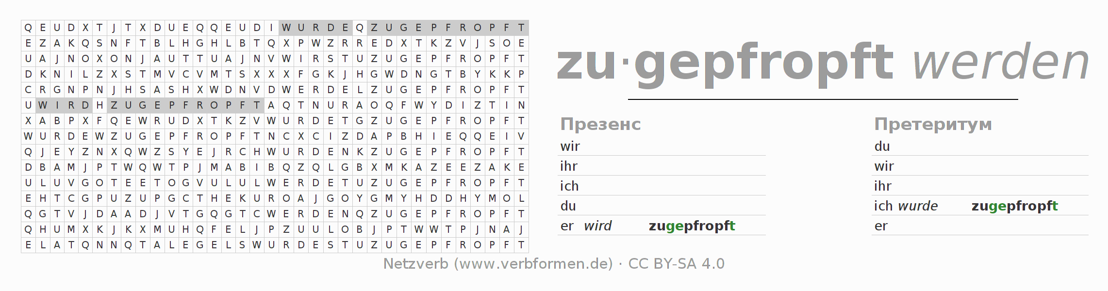 Инструкция: образовать формы глагола zupfropfen и найти их в головоломке, либо распознать изменённую форму zupfropfen в буквенном винегрете и соотнести ее с правильной формой глагола. Умлауты и -ß- транслитерируются соответственно как -oe-, -ae-, -ue- и -ss-.Ответ находится в конце страницы.