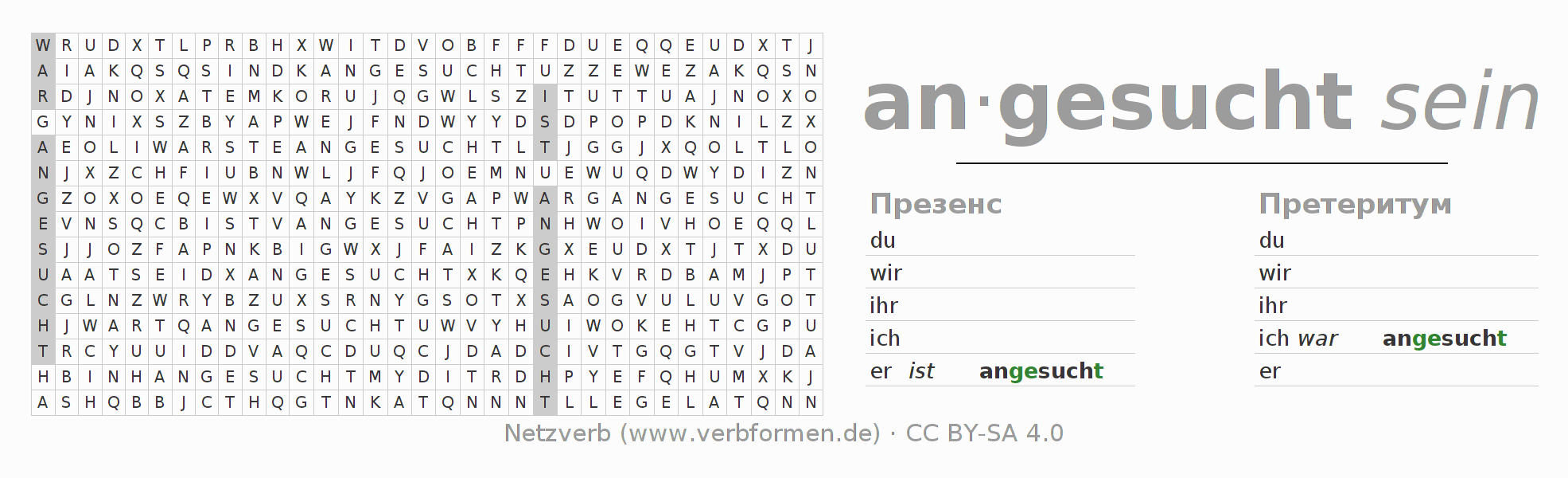 Инструкция: образовать формы глагола ansuchen и найти их в головоломке, либо распознать изменённую форму ansuchen в буквенном винегрете и соотнести ее с правильной формой глагола. Умлауты и -ß- транслитерируются соответственно как -oe-, -ae-, -ue- и -ss-.Ответ находится в конце страницы.