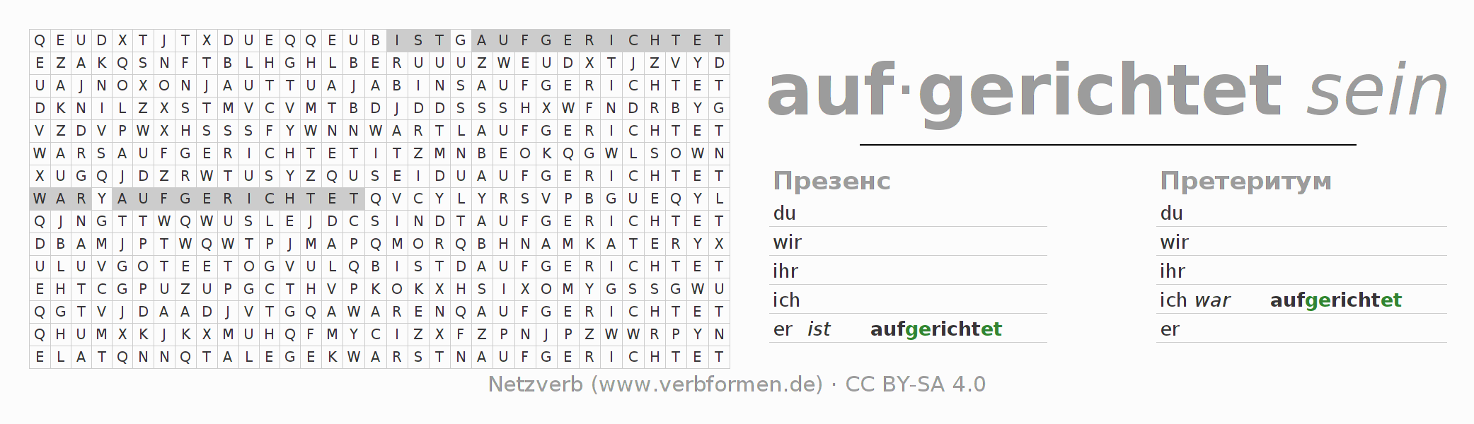 Инструкция: образовать формы глагола aufrichten и найти их в головоломке, либо распознать изменённую форму aufrichten в буквенном винегрете и соотнести ее с правильной формой глагола. Умлауты и -ß- транслитерируются соответственно как -oe-, -ae-, -ue- и -ss-.Ответ находится в конце страницы.