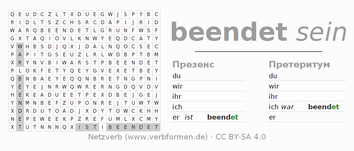 Инструкция: образовать формы глагола beenden и найти их в головоломке, либо распознать изменённую форму beenden в буквенном винегрете и соотнести ее с правильной формой глагола. Умлауты и -ß- транслитерируются соответственно как -oe-, -ae-, -ue- и -ss-.Ответ находится в конце страницы.