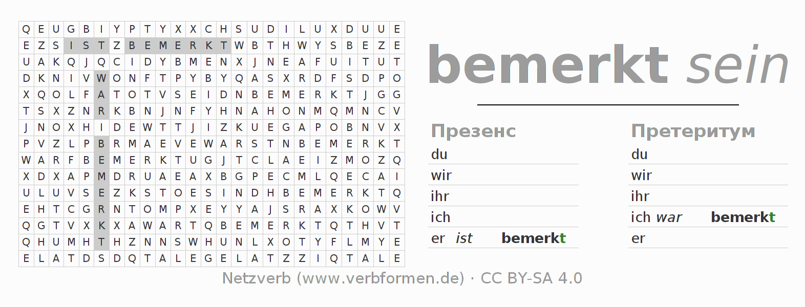 Инструкция: образовать формы глагола bemerken и найти их в головоломке, либо распознать изменённую форму bemerken в буквенном винегрете и соотнести ее с правильной формой глагола. Умлауты и -ß- транслитерируются соответственно как -oe-, -ae-, -ue- и -ss-.Ответ находится в конце страницы.