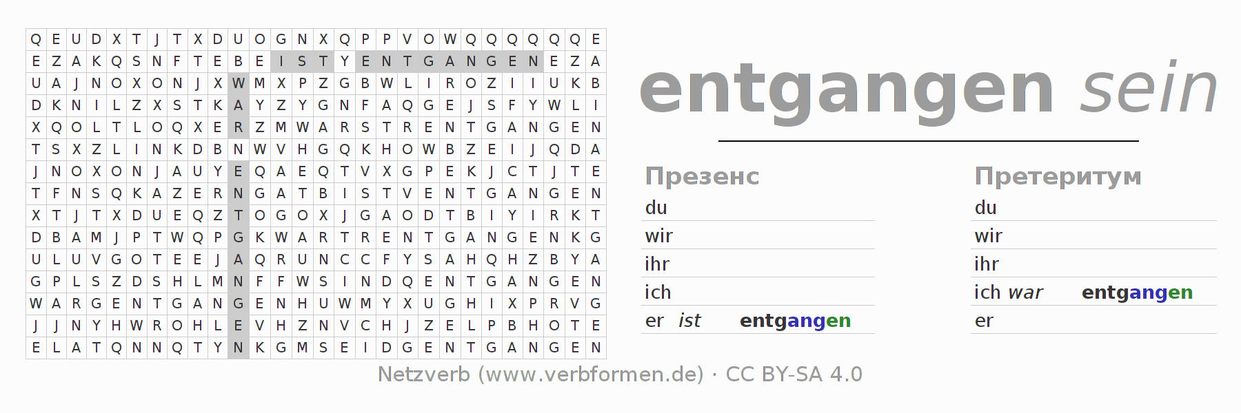 Инструкция: образовать формы глагола entgehen и найти их в головоломке, либо распознать изменённую форму entgehen в буквенном винегрете и соотнести ее с правильной формой глагола. Умлауты и -ß- транслитерируются соответственно как -oe-, -ae-, -ue- и -ss-.Ответ находится в конце страницы.