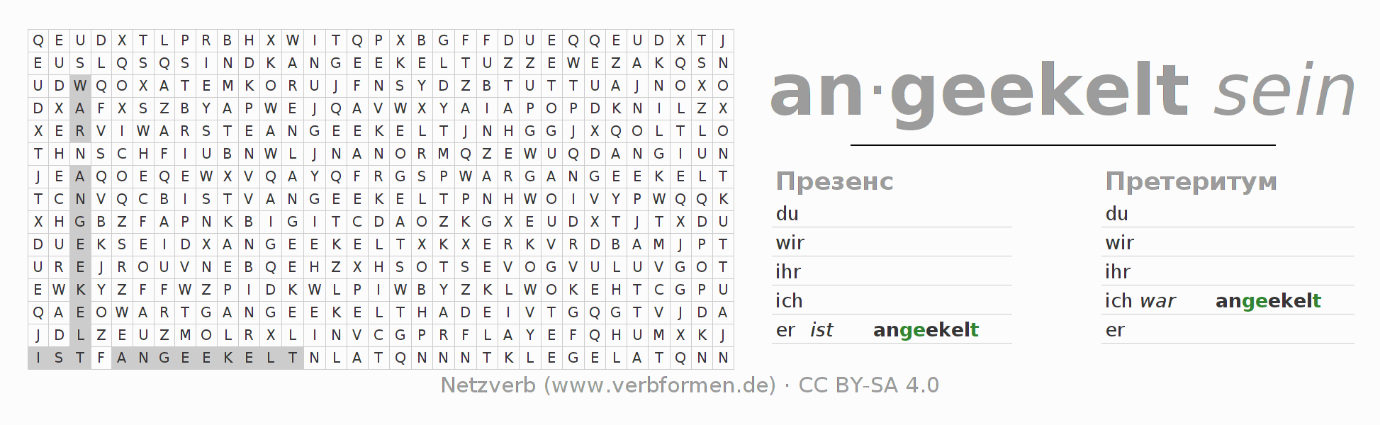 Инструкция: образовать формы глагола anekeln и найти их в головоломке, либо распознать изменённую форму anekeln в буквенном винегрете и соотнести ее с правильной формой глагола. Умлауты и -ß- транслитерируются соответственно как -oe-, -ae-, -ue- и -ss-.Ответ находится в конце страницы.