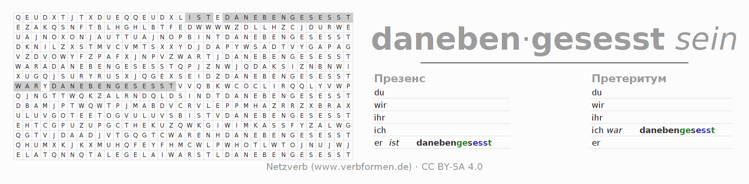 Инструкция: образовать формы глагола danebensitzen и найти их в головоломке, либо распознать изменённую форму danebensitzen в буквенном винегрете и соотнести ее с правильной формой глагола. Умлауты и -ß- транслитерируются соответственно как -oe-, -ae-, -ue- и -ss-.Ответ находится в конце страницы.