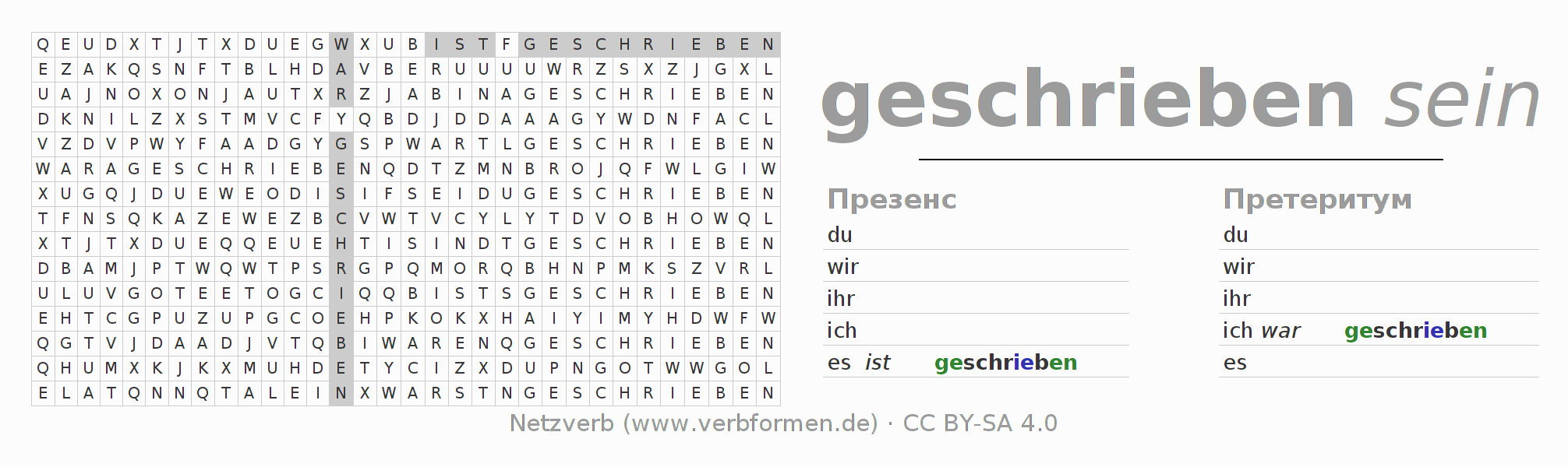 Инструкция: образовать формы глагола sich schreiben и найти их в головоломке, либо распознать изменённую форму sich schreiben в буквенном винегрете и соотнести ее с правильной формой глагола. Умлауты и -ß- транслитерируются соответственно как -oe-, -ae-, -ue- и -ss-.Ответ находится в конце страницы.