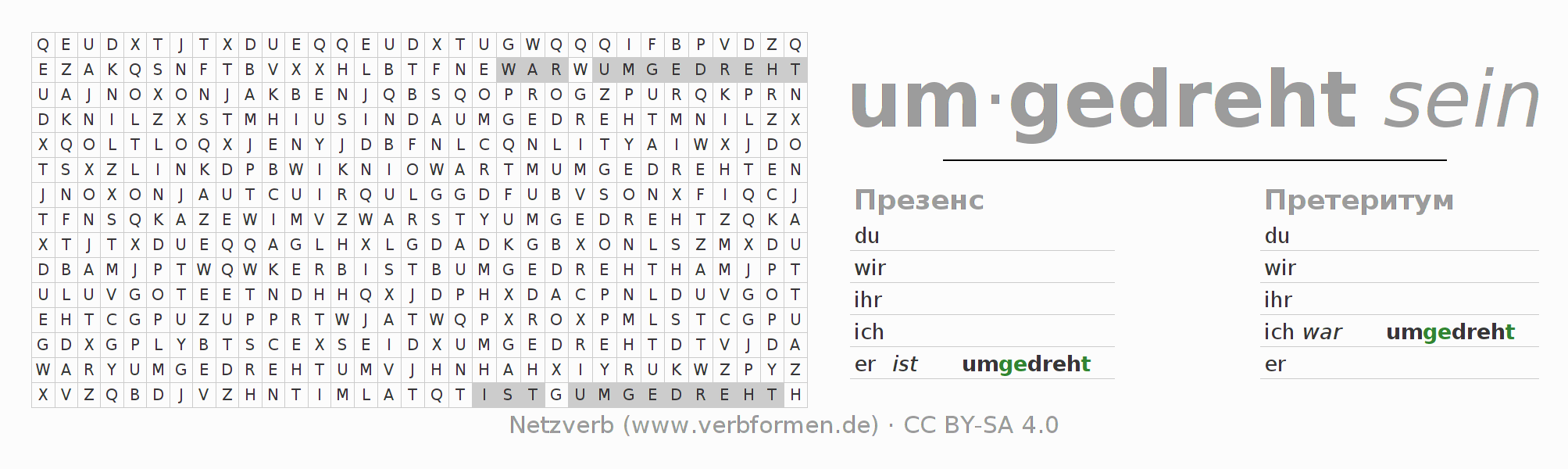 Инструкция: образовать формы глагола umdrehen и найти их в головоломке, либо распознать изменённую форму umdrehen в буквенном винегрете и соотнести ее с правильной формой глагола. Умлауты и -ß- транслитерируются соответственно как -oe-, -ae-, -ue- и -ss-.Ответ находится в конце страницы.