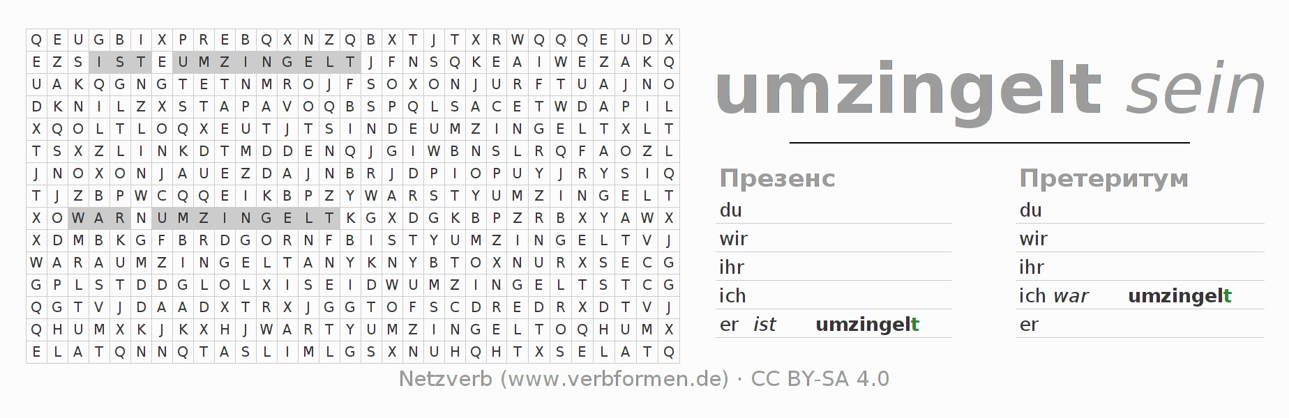 Инструкция: образовать формы глагола umzingeln и найти их в головоломке, либо распознать изменённую форму umzingeln в буквенном винегрете и соотнести ее с правильной формой глагола. Умлауты и -ß- транслитерируются соответственно как -oe-, -ae-, -ue- и -ss-.Ответ находится в конце страницы.