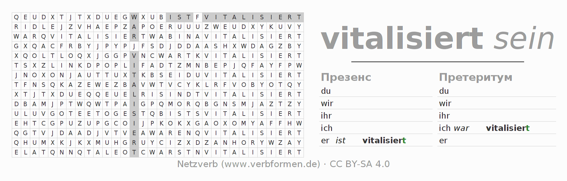 Инструкция: образовать формы глагола vitalisieren и найти их в головоломке, либо распознать изменённую форму vitalisieren в буквенном винегрете и соотнести ее с правильной формой глагола. Умлауты и -ß- транслитерируются соответственно как -oe-, -ae-, -ue- и -ss-.Ответ находится в конце страницы.