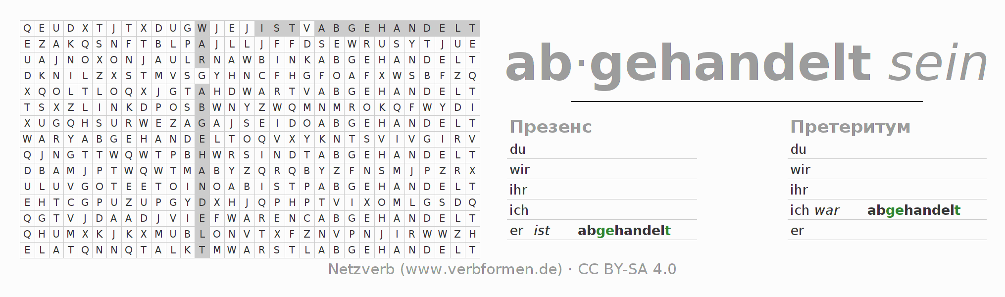 Инструкция: образовать формы глагола abhandeln и найти их в головоломке, либо распознать изменённую форму abhandeln в буквенном винегрете и соотнести ее с правильной формой глагола. Умлауты и -ß- транслитерируются соответственно как -oe-, -ae-, -ue- и -ss-.Ответ находится в конце страницы.