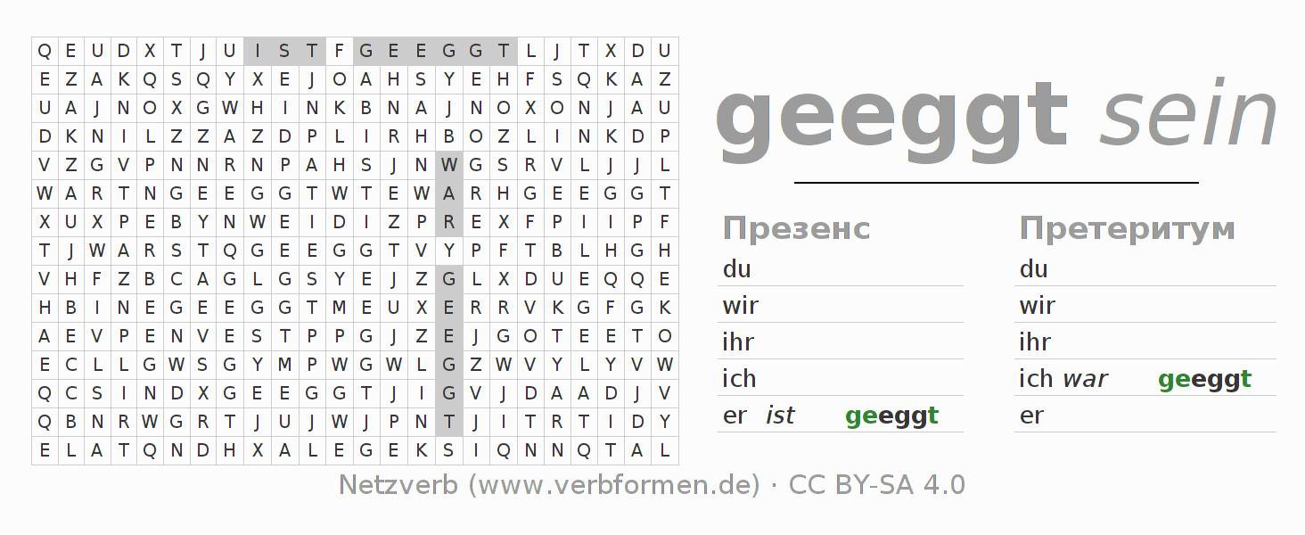 Инструкция: образовать формы глагола eggen и найти их в головоломке, либо распознать изменённую форму eggen в буквенном винегрете и соотнести ее с правильной формой глагола. Умлауты и -ß- транслитерируются соответственно как -oe-, -ae-, -ue- и -ss-.Ответ находится в конце страницы.