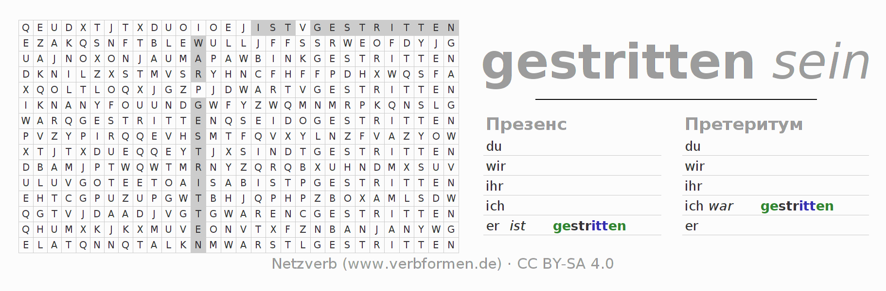 Инструкция: образовать формы глагола streiten и найти их в головоломке, либо распознать изменённую форму streiten в буквенном винегрете и соотнести ее с правильной формой глагола. Умлауты и -ß- транслитерируются соответственно как -oe-, -ae-, -ue- и -ss-.Ответ находится в конце страницы.