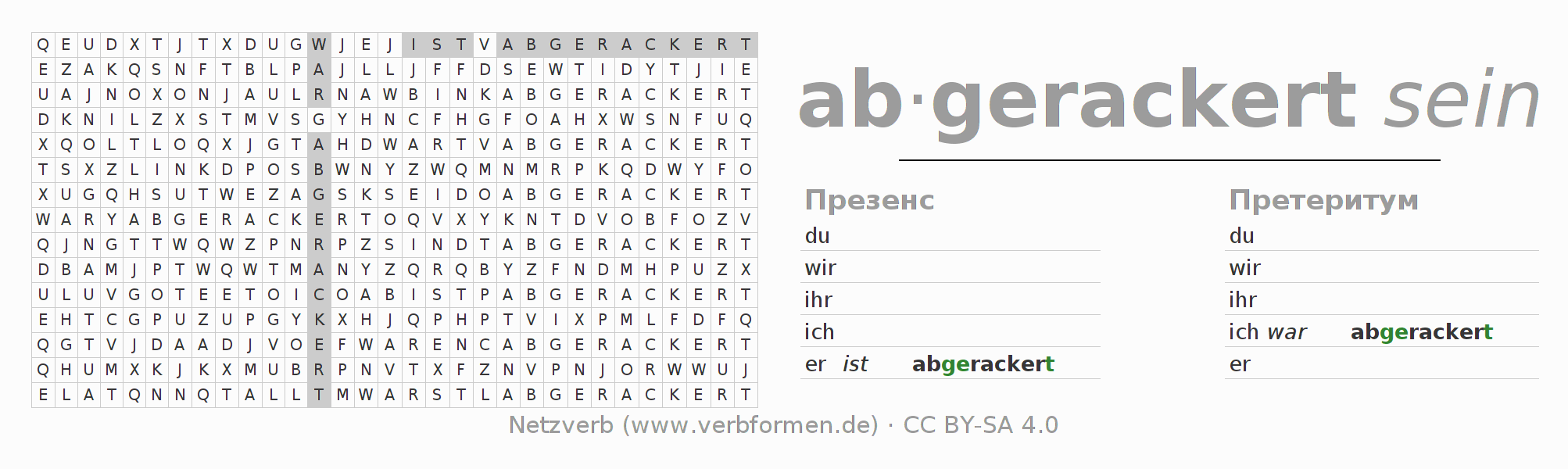 Инструкция: образовать формы глагола sich abrackern и найти их в головоломке, либо распознать изменённую форму sich abrackern в буквенном винегрете и соотнести ее с правильной формой глагола. Умлауты и -ß- транслитерируются соответственно как -oe-, -ae-, -ue- и -ss-.Ответ находится в конце страницы.