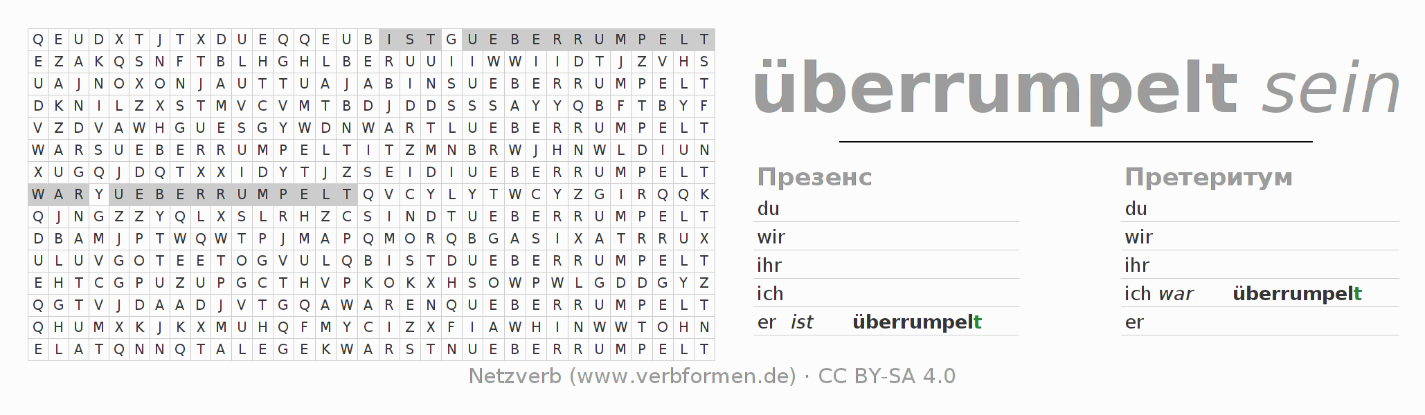 Инструкция: образовать формы глагола überrumpeln и найти их в головоломке, либо распознать изменённую форму überrumpeln в буквенном винегрете и соотнести ее с правильной формой глагола. Умлауты и -ß- транслитерируются соответственно как -oe-, -ae-, -ue- и -ss-.Ответ находится в конце страницы.