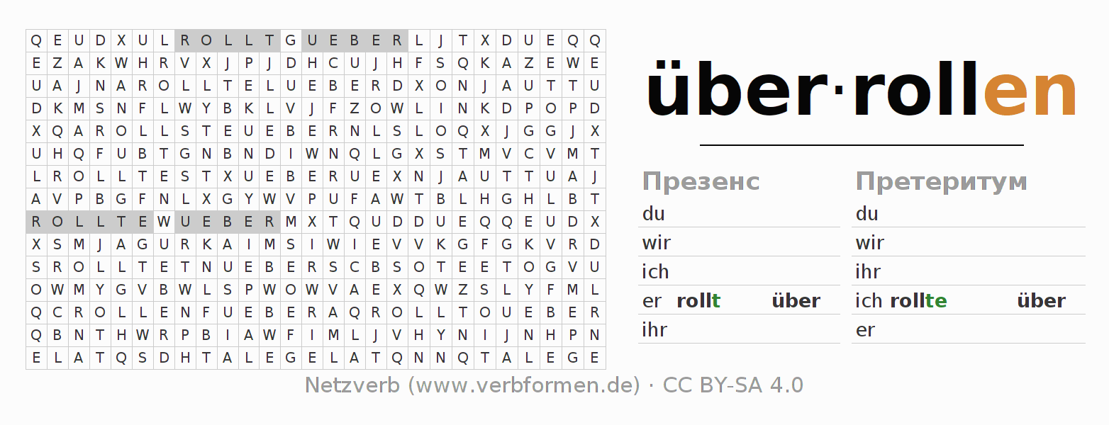 Рабочие материалы служат обучением спряжениям глагола überrollen на уроке и при самообучении. Рабочие материалы могут быть свободно использованы в рамках лицензии CC BY-SA 4.0 в виде Открытых образовательных ресурсов(ООР) например могут быть бесплатно использованы на уроке. Для этого имеется много различных типов рабочих материалов для глагола über-rollen в наличии. Это таблицы спряжений, головоломки и игры. Весь учебный материал доступен бесплатно как файлы PDF, в виде изображений или как интерактивная версия браузера. В дополнение к задачам, имеются бесчисленные примеры для überrollen а также помощь в использовании глаголов.