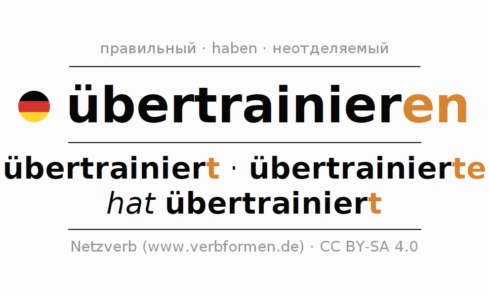 С помощью обучающих карточек можно эффективно и удобно изучать и запоминать глагольные формы übertrainieren. Обучающие карточки можно распечатать в формате PDF и вырезать.