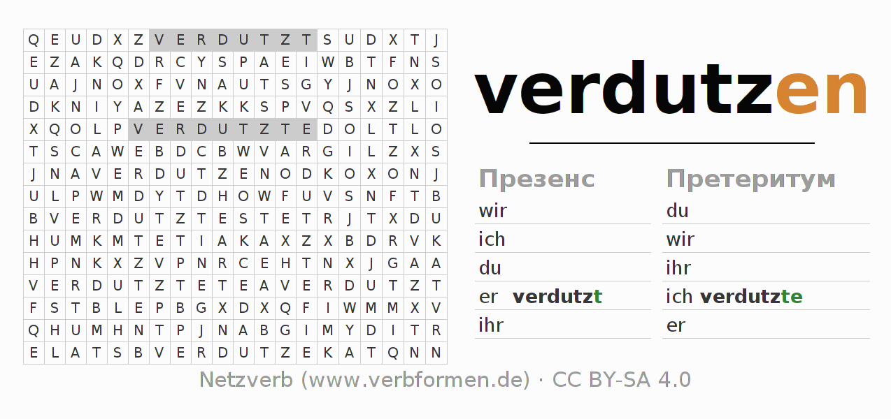 Рабочие материалы служат обучением спряжениям глагола verdutzen на уроке и при самообучении. Рабочие материалы могут быть свободно использованы в рамках лицензии CC BY-SA 4.0 в виде Открытых образовательных ресурсов(ООР) например могут быть бесплатно использованы на уроке. Для этого имеется много различных типов рабочих материалов для глагола verdutzen в наличии. Это таблицы спряжений, головоломки и игры. Весь учебный материал доступен бесплатно как файлы PDF, в виде изображений или как интерактивная версия браузера. В дополнение к задачам, имеются бесчисленные примеры для verdutzen а также помощь в использовании глаголов.