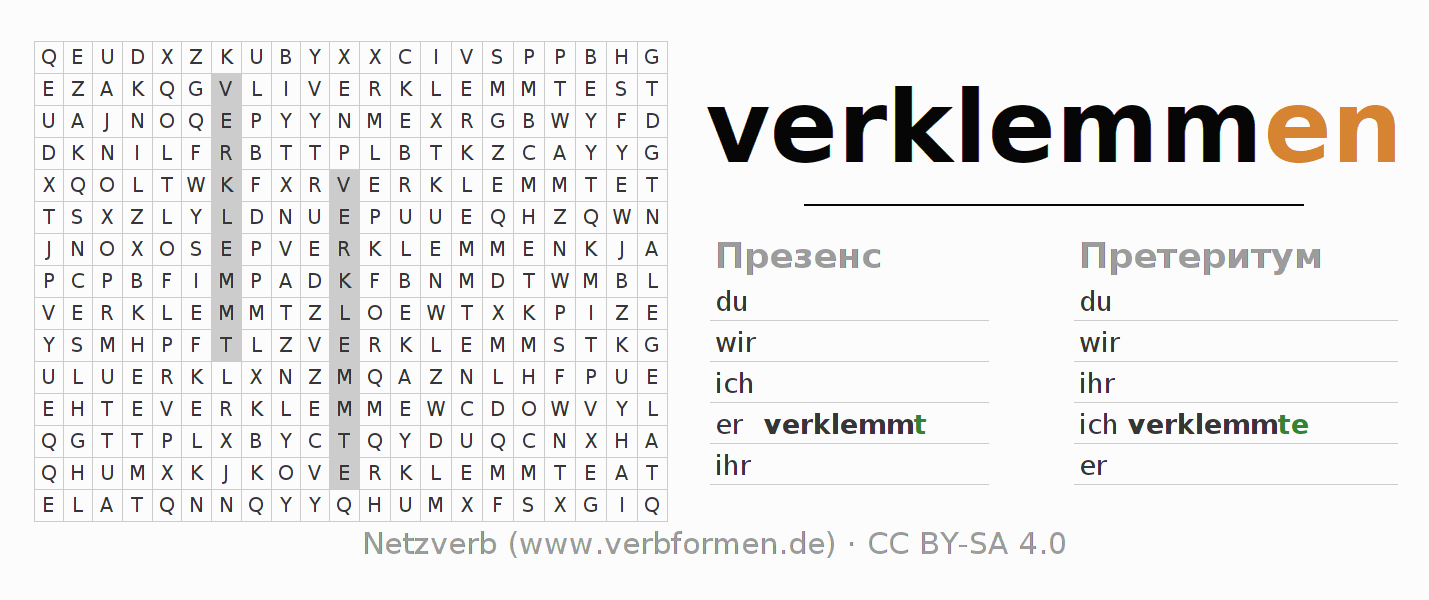 С помощью этих головоломок по поиску слов Вы можете подходящим для Вас способом изучать спряжение немецкого глагола verklemmen.