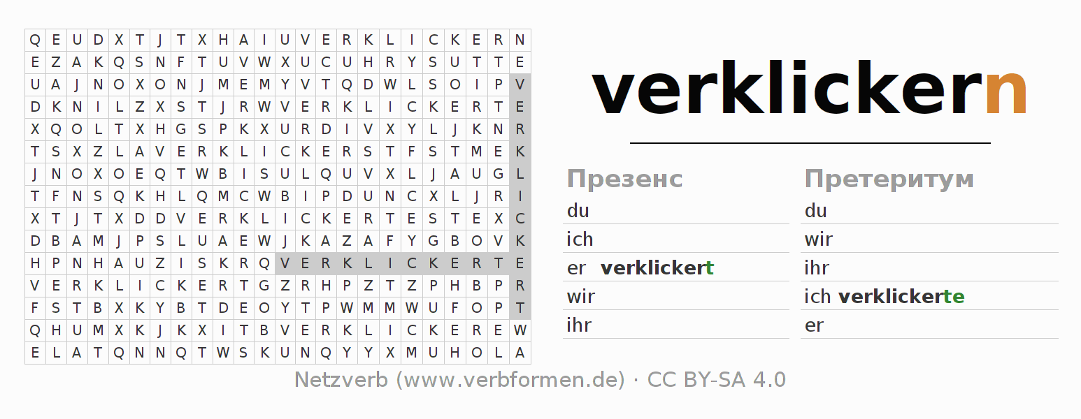 С помощью этих головоломок по поиску слов Вы можете подходящим для Вас способом изучать спряжение немецкого глагола verklickern.