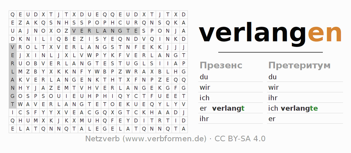 Рабочие материалы служат обучением спряжениям глагола verlangen на уроке и при самообучении. Рабочие материалы могут быть свободно использованы в рамках лицензии CC BY-SA 4.0 в виде Открытых образовательных ресурсов(ООР) например могут быть бесплатно использованы на уроке. Для этого имеется много различных типов рабочих материалов для глагола verlangen в наличии. Это таблицы спряжений, головоломки и игры. Весь учебный материал доступен бесплатно как файлы PDF, в виде изображений или как интерактивная версия браузера. В дополнение к задачам, имеются бесчисленные примеры для verlangen а также помощь в использовании глаголов.