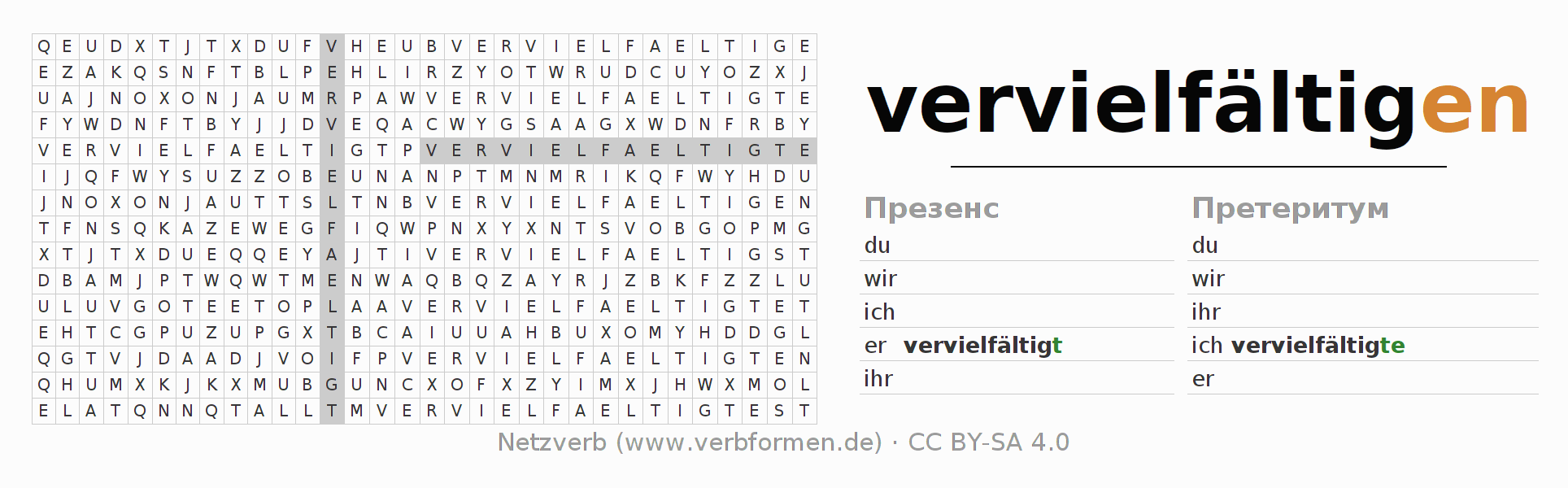Рабочие материалы служат обучением спряжениям глагола vervielfältigen на уроке и при самообучении. Рабочие материалы могут быть свободно использованы в рамках лицензии CC BY-SA 4.0 в виде Открытых образовательных ресурсов(ООР) например могут быть бесплатно использованы на уроке. Для этого имеется много различных типов рабочих материалов для глагола vervielfältigen в наличии. Это таблицы спряжений, головоломки и игры. Весь учебный материал доступен бесплатно как файлы PDF, в виде изображений или как интерактивная версия браузера. В дополнение к задачам, имеются бесчисленные примеры для vervielfältigen а также помощь в использовании глаголов.