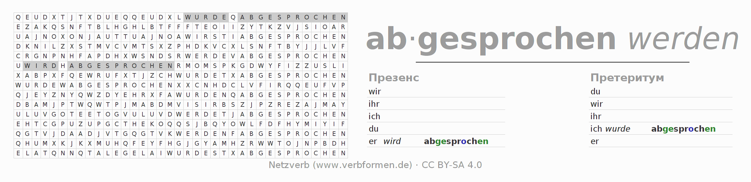 Рабочие материалы служат обучением спряжениям глагола absprechen на уроке и при самообучении. Рабочие материалы могут быть свободно использованы в рамках лицензии CC BY-SA 4.0 в виде Открытых образовательных ресурсов(ООР) например могут быть бесплатно использованы на уроке. Для этого имеется много различных типов рабочих материалов для глагола absprechen в наличии. Это таблицы спряжений, головоломки и игры. Весь учебный материал доступен бесплатно как файлы PDF, в виде изображений или как интерактивная версия браузера. В дополнение к задачам, имеются бесчисленные примеры для absprechen а также помощь в использовании глаголов.