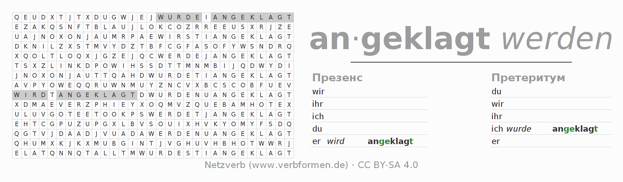С помощью этих головоломок по поиску слов Вы можете подходящим для Вас способом изучать спряжение немецкого глагола anklagen.