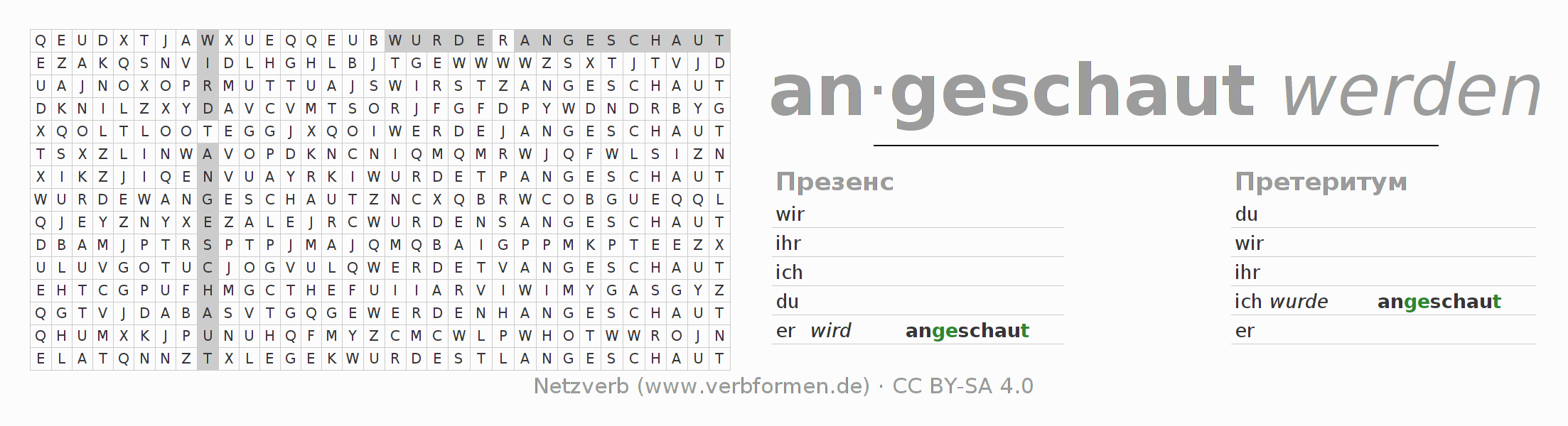 С помощью этих головоломок по поиску слов Вы можете подходящим для Вас способом изучать спряжение немецкого глагола anschauen.