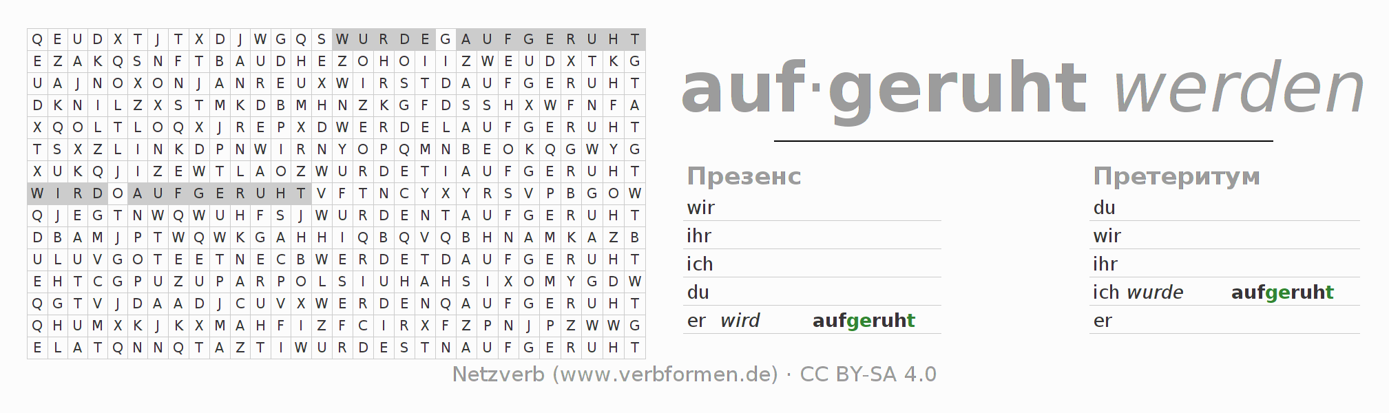 Рабочие материалы служат обучением спряжениям глагола aufruhen на уроке и при самообучении. Рабочие материалы могут быть свободно использованы в рамках лицензии CC BY-SA 4.0 в виде Открытых образовательных ресурсов(ООР) например могут быть бесплатно использованы на уроке. Для этого имеется много различных типов рабочих материалов для глагола aufruhen в наличии. Это таблицы спряжений, головоломки и игры. Весь учебный материал доступен бесплатно как файлы PDF, в виде изображений или как интерактивная версия браузера. В дополнение к задачам, имеются бесчисленные примеры для aufruhen а также помощь в использовании глаголов.