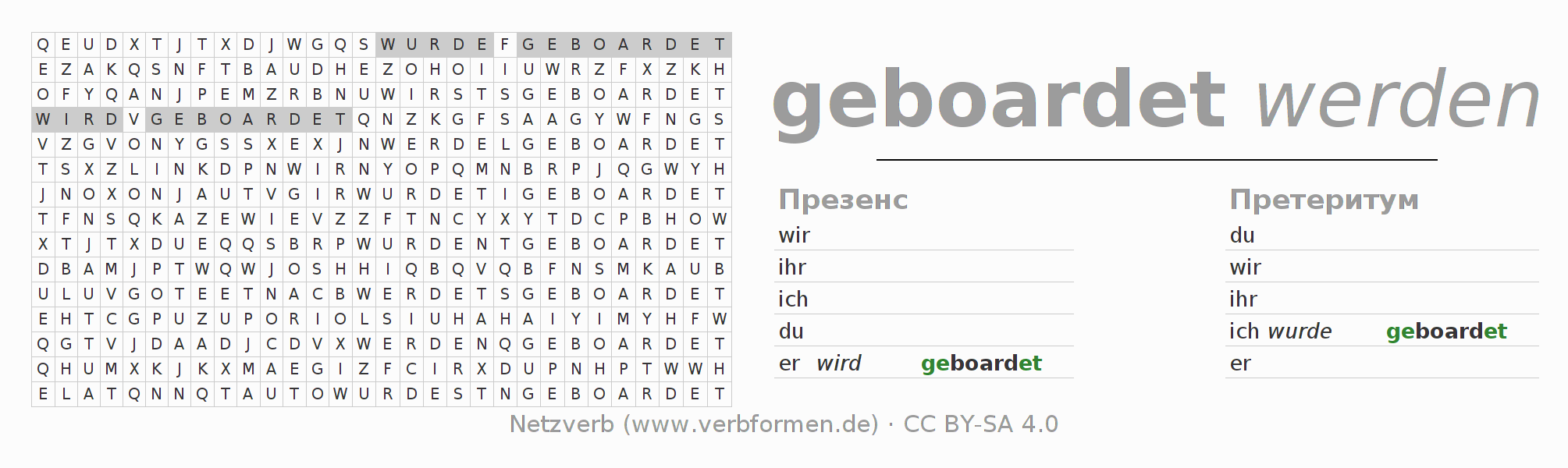 С помощью этих головоломок по поиску слов Вы можете подходящим для Вас способом изучать спряжение немецкого глагола boarden.