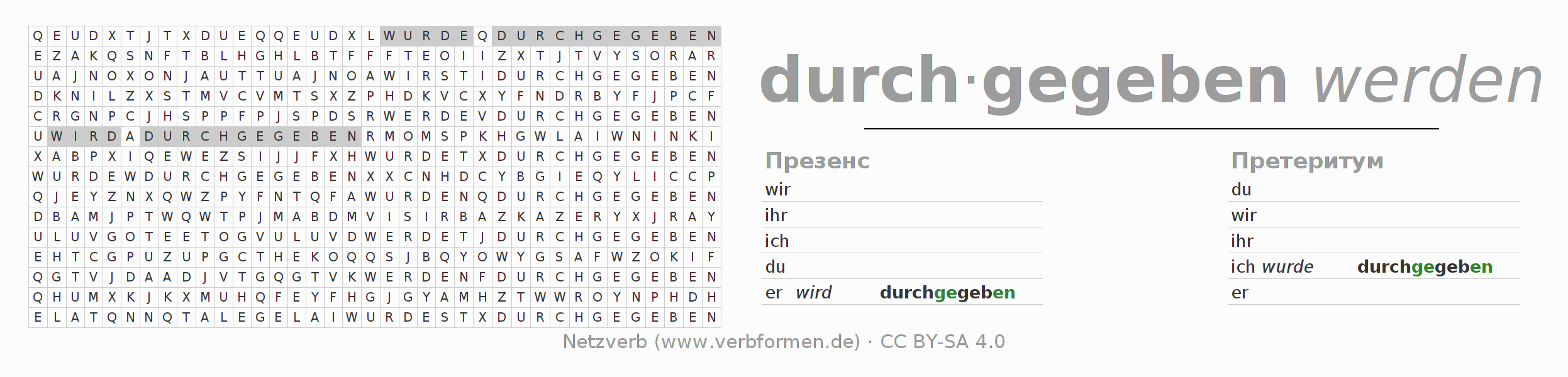 Глагольные таблицы, содержащие все формы глагола durchgeben, для наглядности объединены в одну общую таблицу.