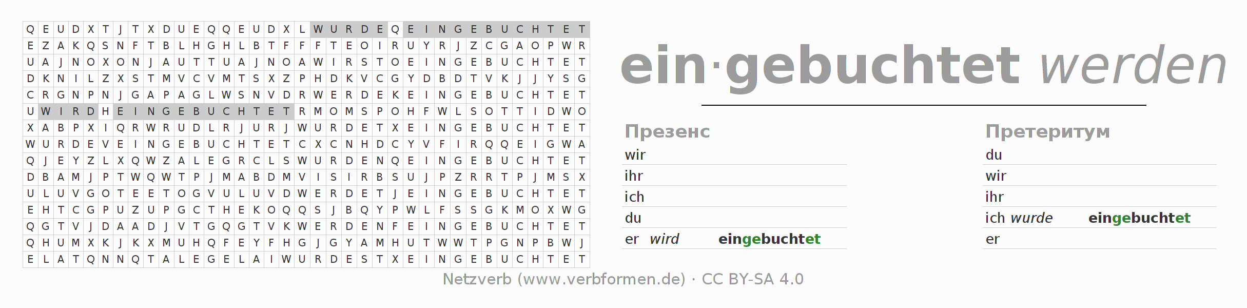 С помощью этих головоломок по поиску слов Вы можете подходящим для Вас способом изучать спряжение немецкого глагола einbuchten.