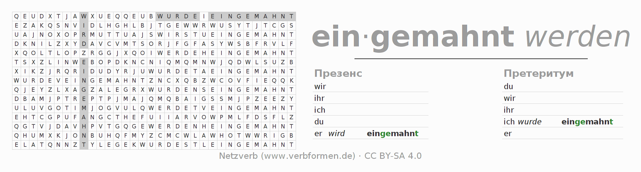 С помощью этих головоломок по поиску слов Вы можете подходящим для Вас способом изучать спряжение немецкого глагола einmahnen.