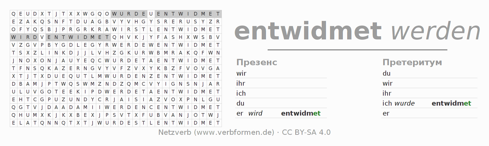 Глагольные таблицы, содержащие все формы глагола entwidmen, для наглядности объединены в одну общую таблицу.